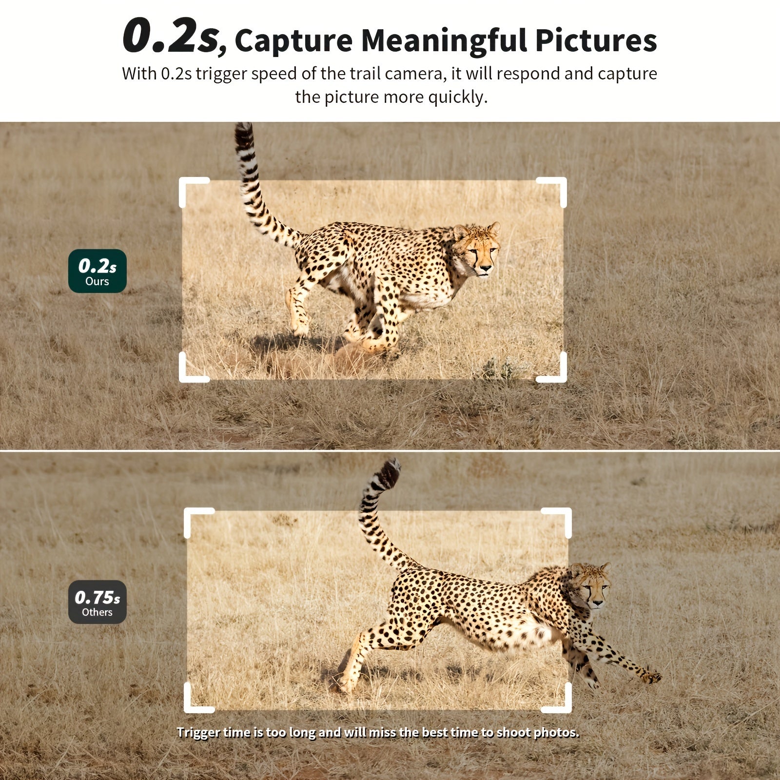 The 0.2-second trigger speed ensures even fast-moving deer, hogs, or predators are captured instantly in crisp detail. No more missed shots.