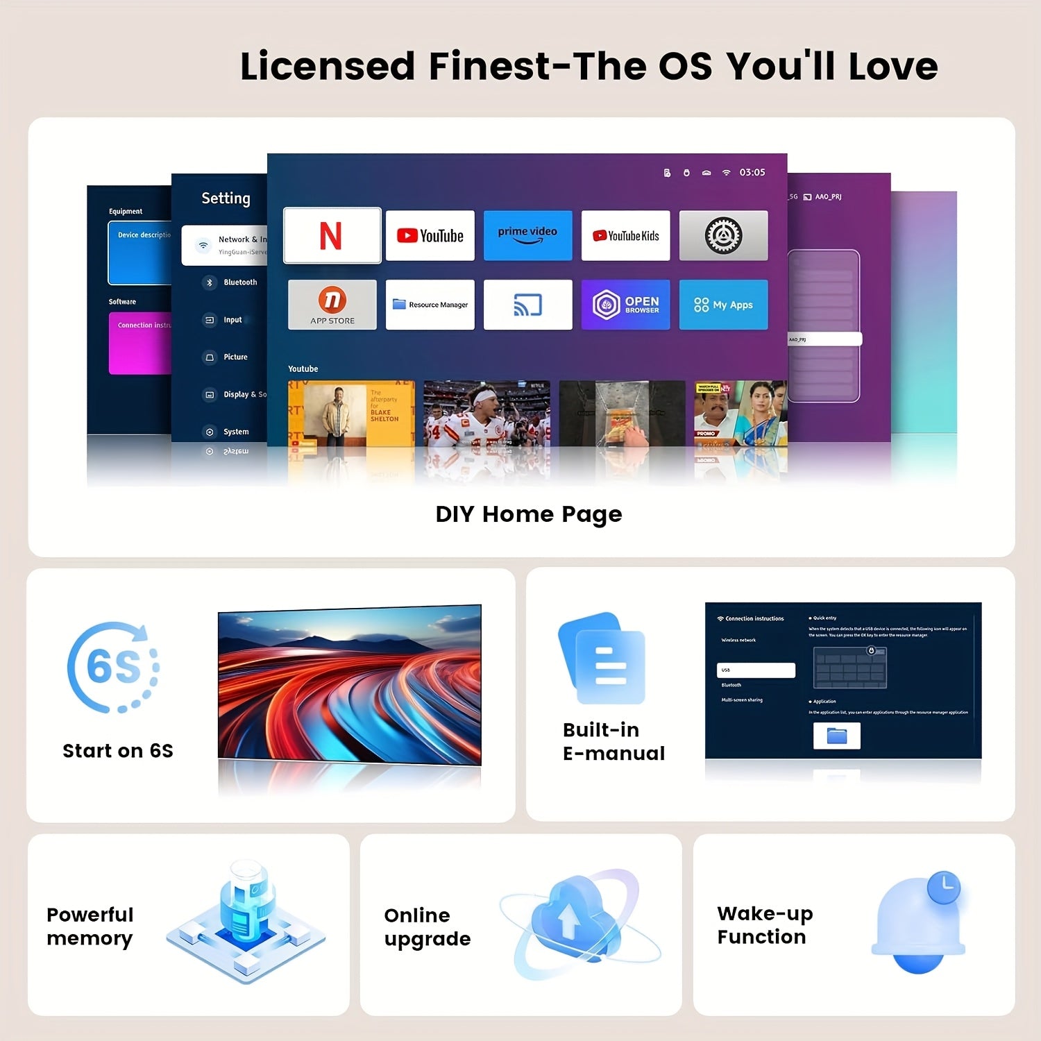 Why fumble with Fire Sticks, cables, or laptops? This projector has Netflix, YouTube, Disney+, Prime, and more preloaded. Just connect to WiFi and start streaming. Faster connections with WiFi 6 keep your movies, presentations, and games smooth—no buffering rage.