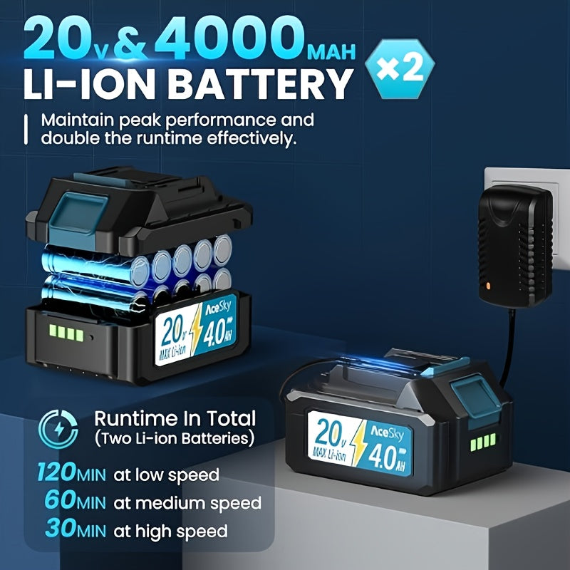 Each 4.0Ah battery provides 20–30 minutes of continuous use, depending on the speed setting. With 2 included batteries, you get up to 1 hour+ of total runtime.